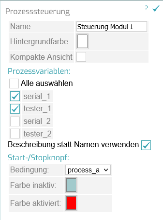 Konkret müssen diese Textvariablen in der Konfiguration unter Manuelle Bedienelemente definiert werden. Außerdem muss für jeden Prozess ein Schalter definiert werden. Mit Hilfe des Dashboard-Elements Prozesssteuerung werden diese Elemente dann zu einem Prozess verknüpft.