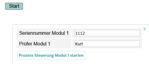 - Das Anzeigeelement stellt nur einen Startschalter dar. Wird dieser gedrückt, so öffnet sich die Eingabemaske für die Textbausteine. Erst wenn diese vom Benutzer geschlossen wird, wird die Bedingung, die den Prozess startet, wahr, und der Prozess läuft los. Der Inhalt der Textbausteine ist auf 80 Zeichen begrenzt.